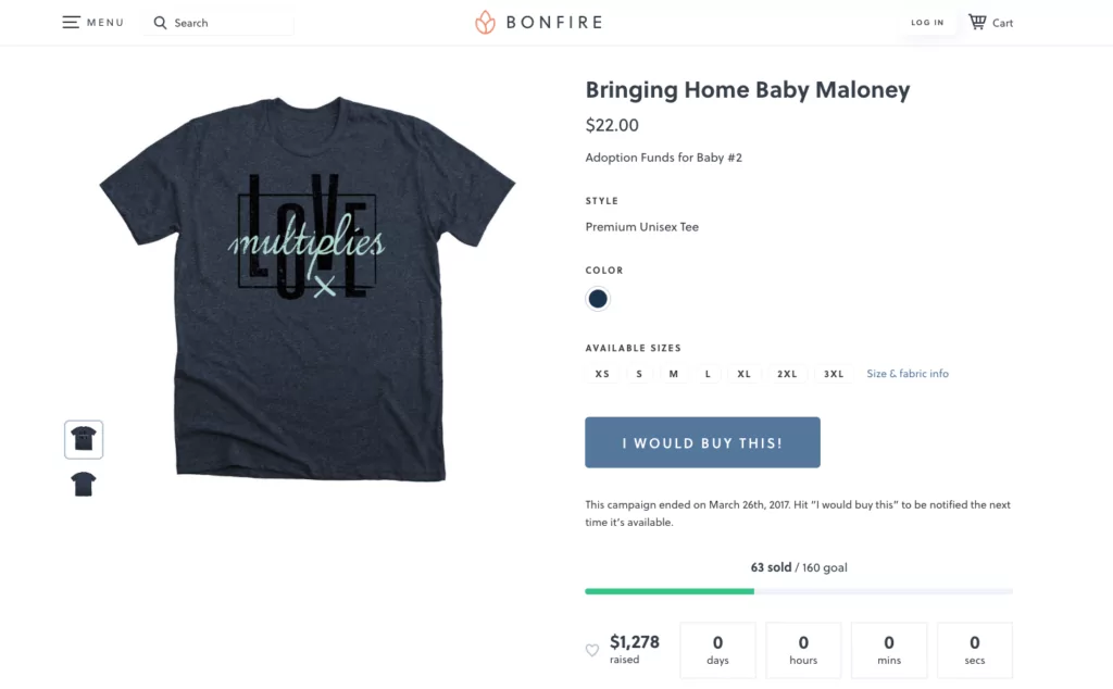Launching an adoption t-shirt fundraiser through Bonfire is a risk-free, high return option for adopting families because our platform is 100% free to use, and there are no upfront or inventory costs. Compared to other fundraising options, t-shirt fundraisers can help you raise so much money without investing a single penny. Plus, all you have to do is create your t-shirt design and launch your campaign, we handle the printing, shipping, and all other logistics.