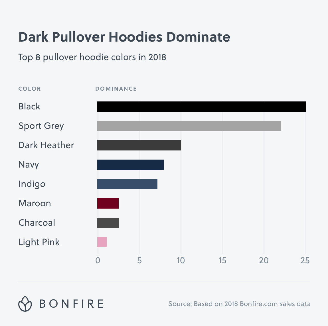 According to our data, the pullover hoodie is the most popular t-shirt alternative in 26 of the 50 states. If you’re in one of those 26 states, there’s a really good chance it’s either black, sport grey, or dark heather. These colors show up way more frequently:The exceptions? Alaska is the only state without a black hoodie in their top three colors. While Rhode Island’s light pink hoodie is the only bright colored hoodie in a sea of black and sport grey.