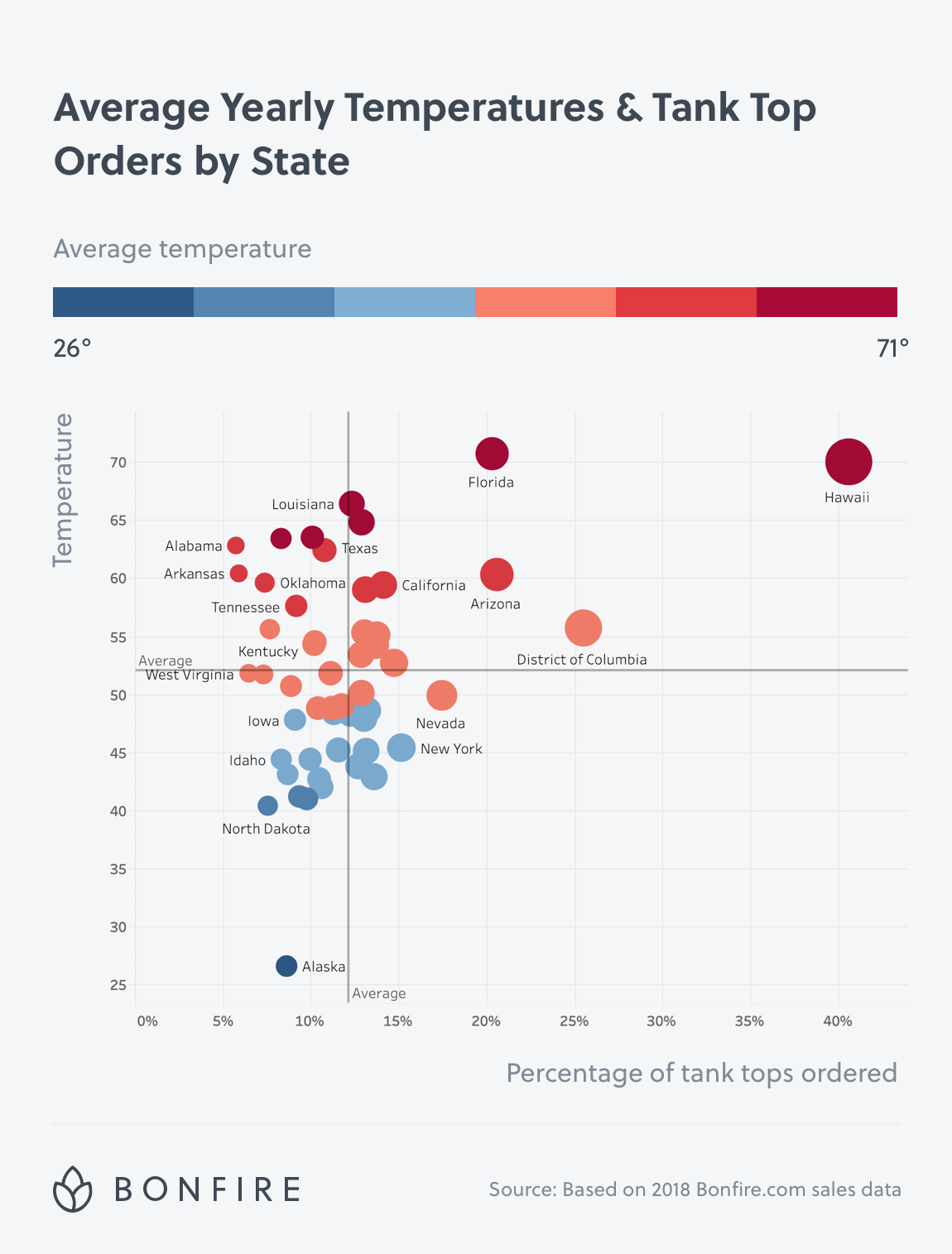Using the percentage of total orders that tank tops accounted for in each state combined with their average annual temperature, we found that people in warmer states are more likely to wear a tank top. But, that’s not always the case.