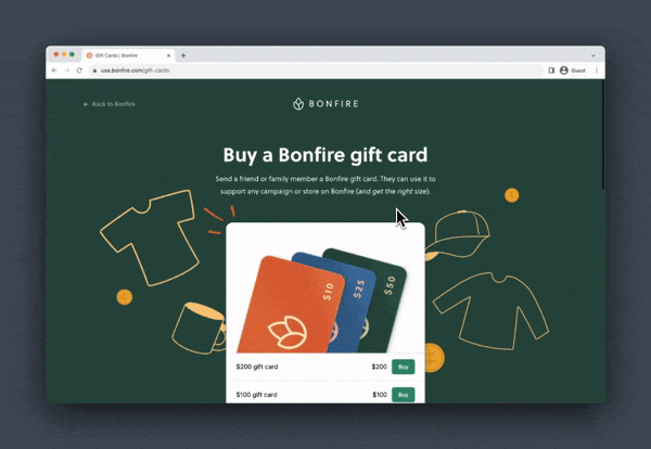 It’s super easy to buy a Bonfire gift card! Begin by navigating to the Bonfire gift cards page. You can access this page from the Bonfire homepage under the Explore tab, as well as on campaign pages, the Dashboard, in the cart, and on the Gifts That Give Back Page.