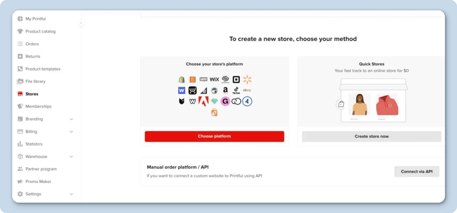 When using Quick stores, keep in mind that payouts only occur once a month. You need to connect it to a selling platform you already own or set up yourself — Shopify, Amazon, Etsy, Squarespace, or similar. Printful does not collect payments or manage your store; it simply fulfills orders once they come in. Their Quick Stores option allows selling without a separate platform, though functionality is limited and payouts occur only once a month.