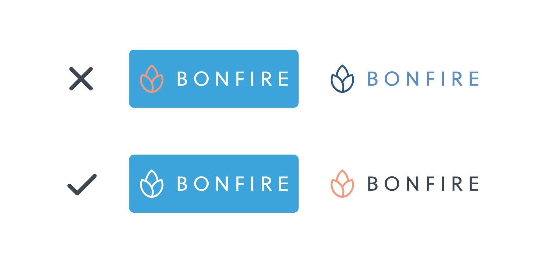 When using the Bonfire logo on solid color backgrounds, both the Bonflower and the Wordmark should be one color, either white or gray. The logo should never be recolored (only full white, full gray, or orange Bonflower with gray Wordmark).