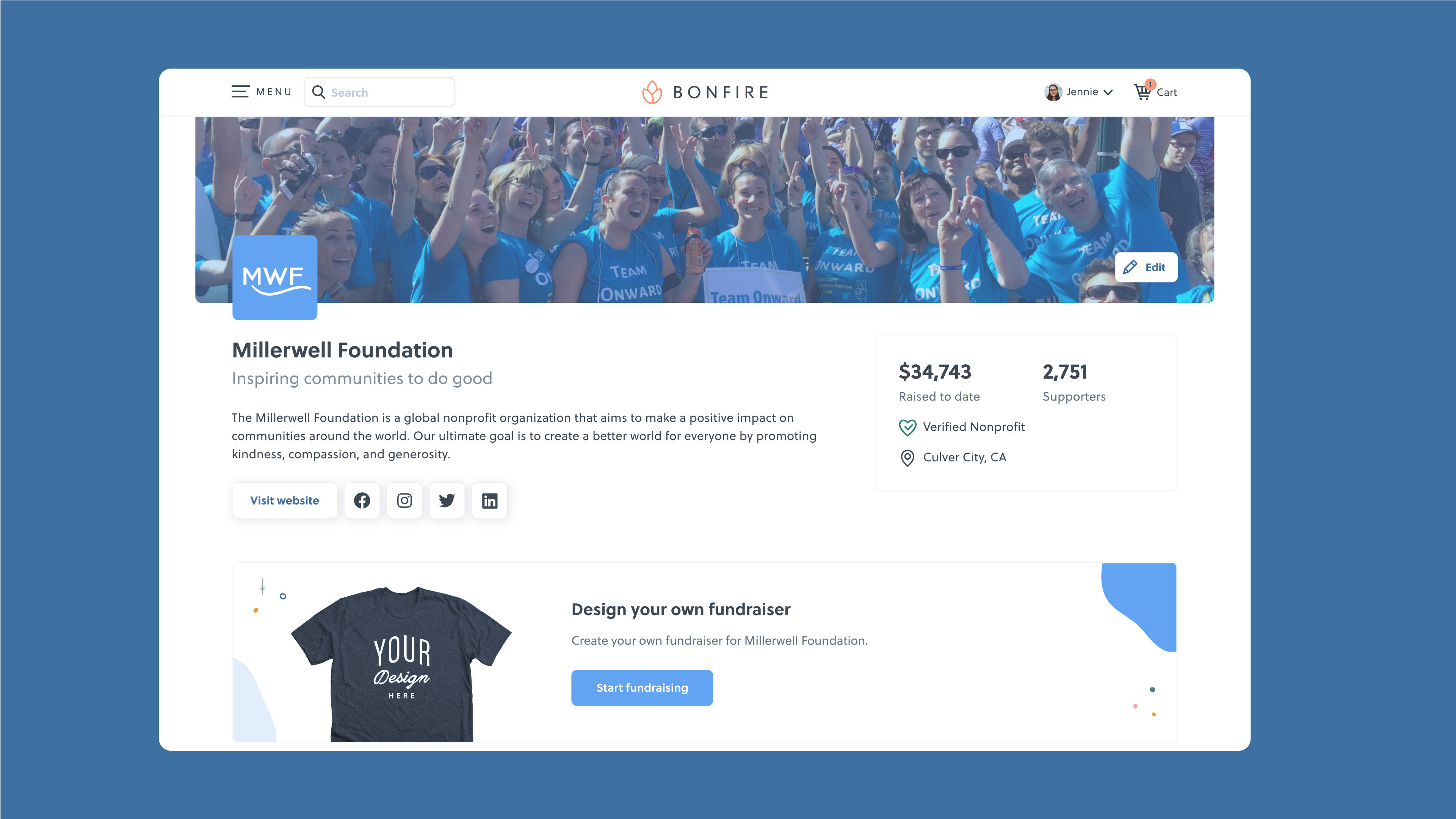 When a nonprofit organization launches a campaign on Bonfire, they get access to their own organization profile page (org. profile page). This page is their home to highlight information about the organization, show off fundraising stats, highlight their Bonfire Store, their active campaigns, and showcase any Giving Campaigns that are fundraising on their behalf.