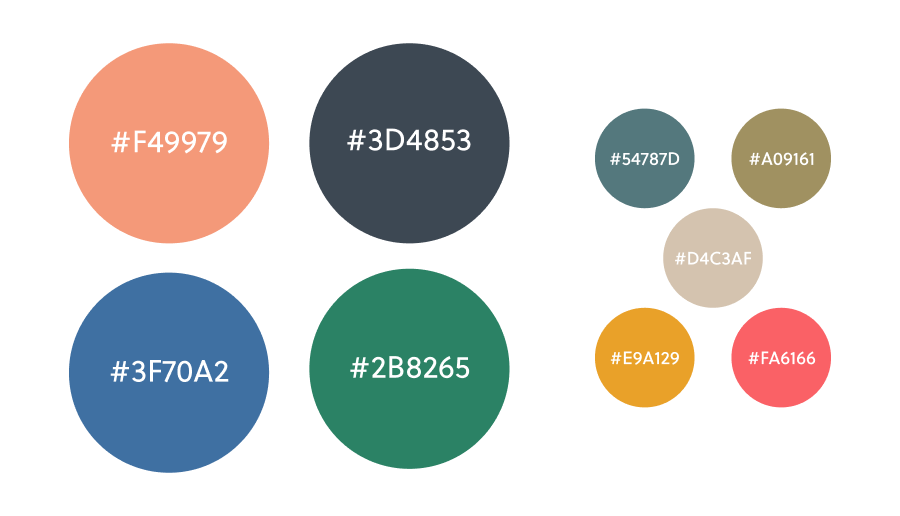 Orange 300 #F49979 | Gray 600 #3D4853 | Blue 400 #3F70A2 | Green 400 #2B8265