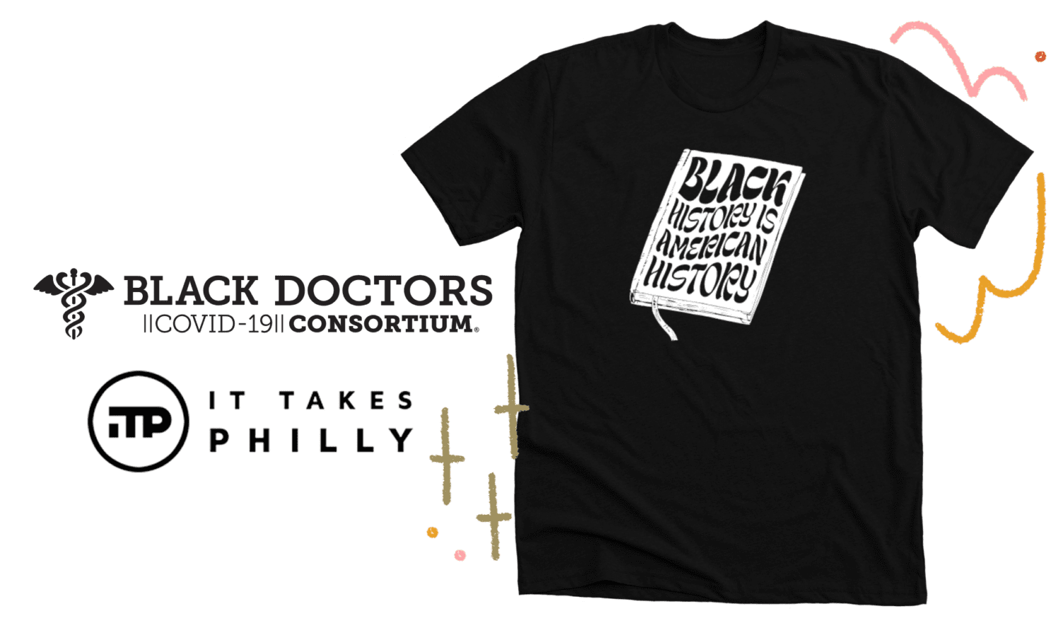 The Black History is American History campaign was started by Be Goods, a collection of Designers in Philly who “love creating art for good.” Proceeds from this campaign directly benefit It Takes Philly and their Black Doctors COVID-19 Consortium initiative which works to bring COVID testing and vaccinations to the neighborhoods where Black people live, work, and play. Their mission is to bring culturally competent, low-cost, and accessible healthcare to the people that need it most.