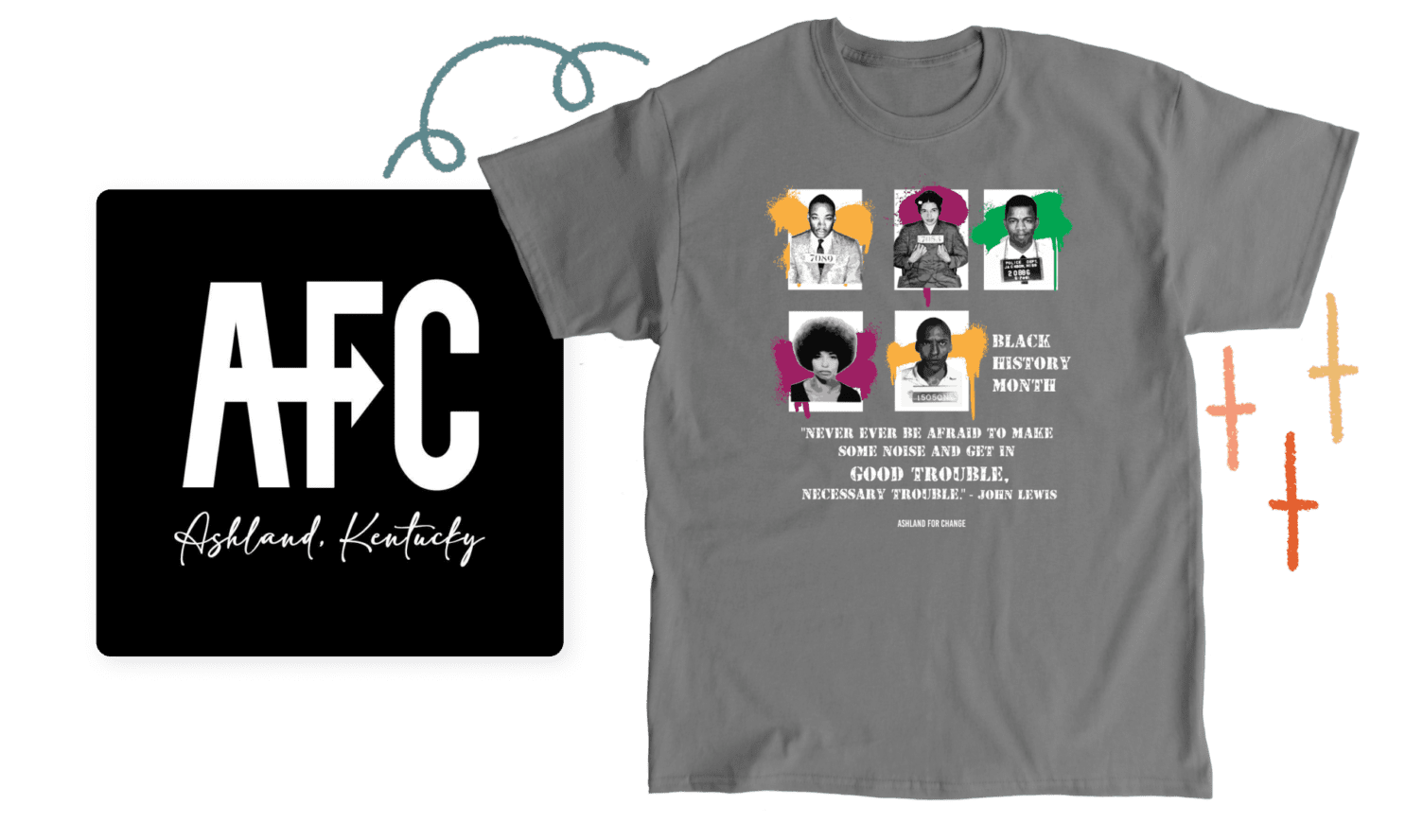 The Good Trouble: Black History campaign was designed by Ashland Pride to raise funds for Ashland for Change, a community-led organization in Ashland, Kentucky geared toward educating others on societal inequality and discrimination toward minority groups. AFC is seeking community and governmental changes to become a more progressive Appalachian city.