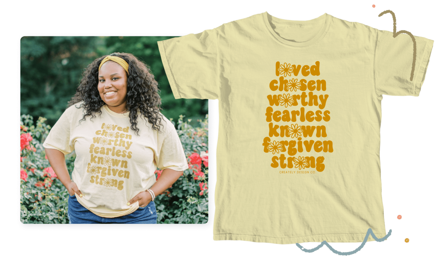 The Kingdom Identity Tee campaign was designed by artist Hailey of Creately Design Co. Hailey is a “joy seeker and encourager” who created this tee to help empower others to live by the words she included in the design: loved, chosen, worthy, fearless, known, forgiven, strong.