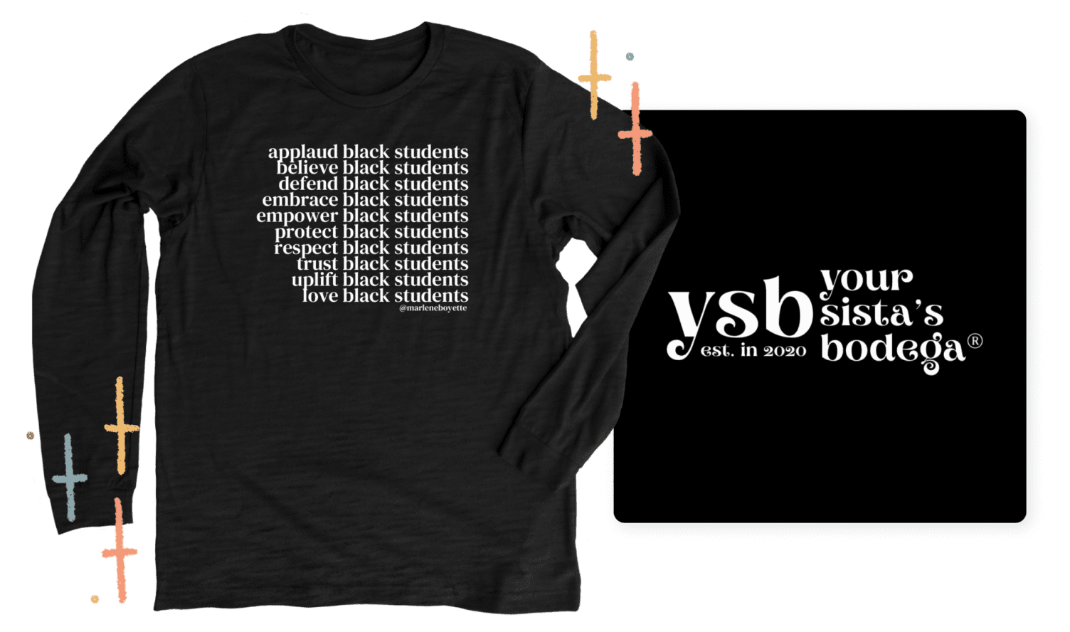 The Protect Black Students campaign was created by Marlene Boyette of Your Sista’s Bodega – mindful merch designs that prioritize wellness and center culture. Marlene designed this shirt because “There is so much going on in the world. Our Black students of color need to know that we’ve got their backs. Remind them that they are deserving of all that is listed on this shirt, and more!”