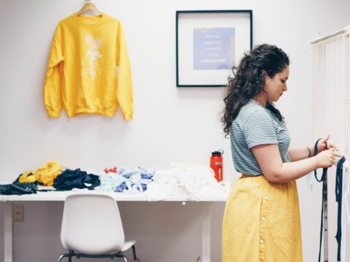 Emily Nicolaides upcycles T-shirt waste into an awesome wall hanging for the Bonfire HQ. The Bonfire Campaign model is designed to minimize t-shirt waste by only printing t-shirts that are bought and paid for– no leftover inventory, and no boxes of t-shirts in the garbage. But sometimes shirts print incorrectly
