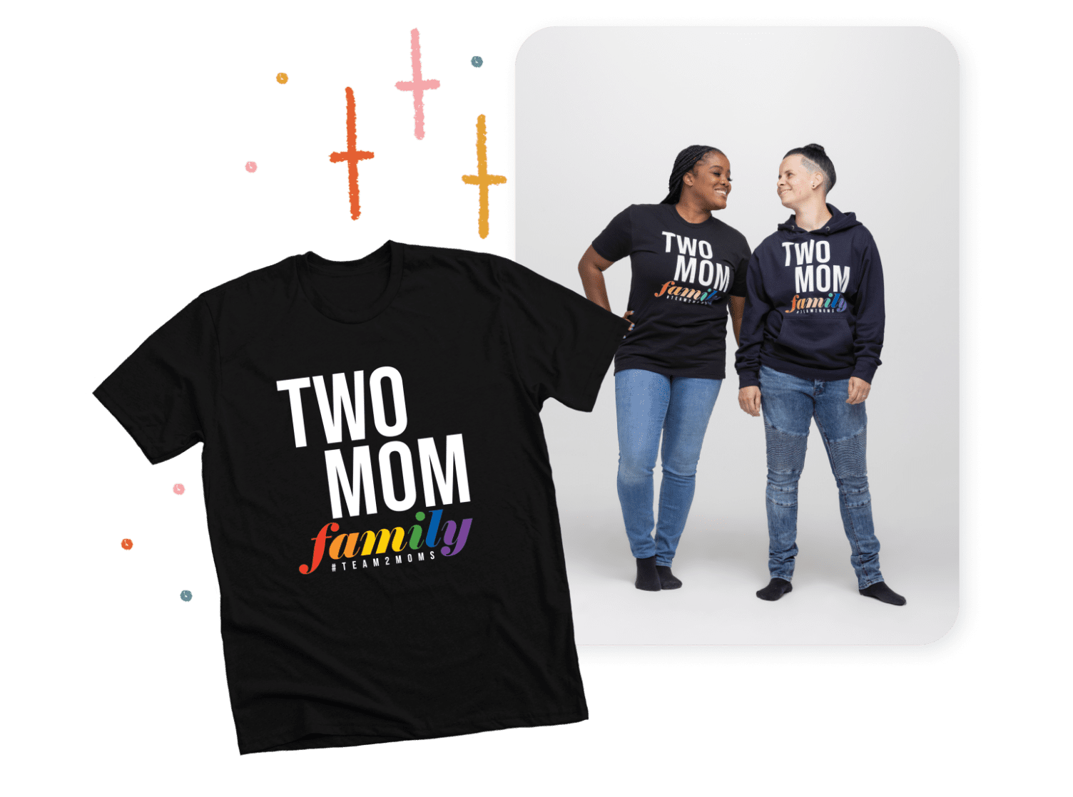 Team2Moms created their Two Mom Family campaign to raise funds for The Trevor Project, the world’s largest suicide prevention and crisis intervention organization for lesbian, gay, bisexual, transgender, queer, and questioning (LGBTQ) young people. Check out the Team2Moms’ merch store to support their fundraising campaigns.