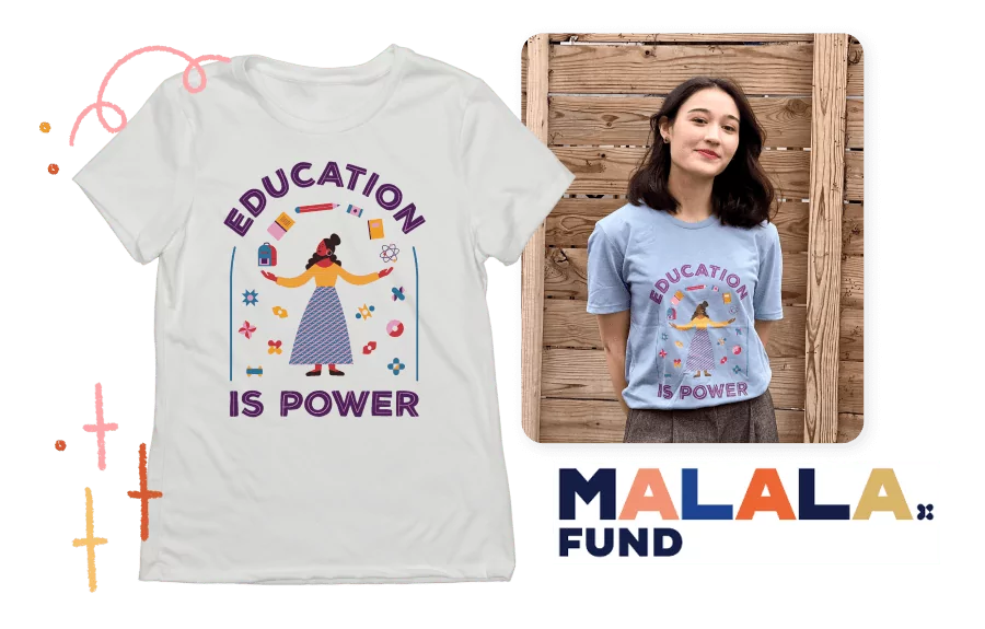 The Education Is Power campaign is donating 100% of proceeds to Malala Fund, an organization created by Malala and Ziauddin Yousafzai in 2013 that champions every girl’s right to 12 years of free, safe, quality education. Malala Fund invests in education activists and advocates who are driving solutions to barriers to girls’ education in their communities. Original artwork for this campaign was created by Meroo Seth.
