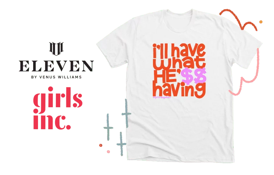 The I’ll Have What He’s Having campaign was created by Venus Williams and her brand EleVen by Venus Williams to raise awareness about wage inequality and to raise funds for Girls Inc., a nonprofit that works to ensure all girls have the experiences and opportunities to thrive. Venus Williams’ inaugural #PrivelegeTax campaign is shining a spotlight on wage inequality during Women’s History Month and is fighting to close the gap across all industries. Original artwork for this shirt was created by artist Keisha Leon.
