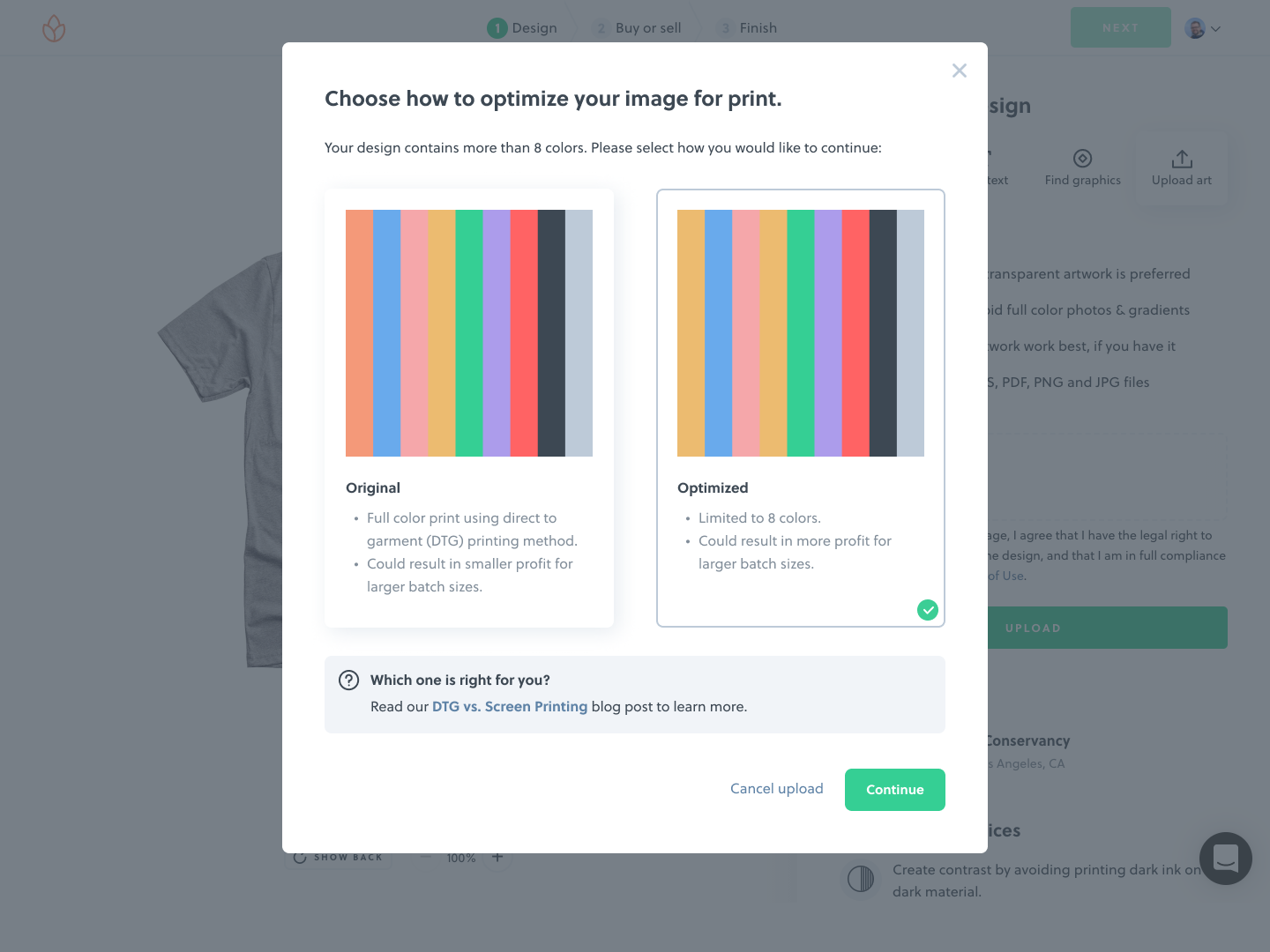 How does full color printing work? When you upload an image with more than 8 colors, you will now be given the choice of whether you want to optimize the design or not. If you select “Optimized”, then you will continue as normal. However, if you select “Original”, then your campaign will now be set as a full color design.