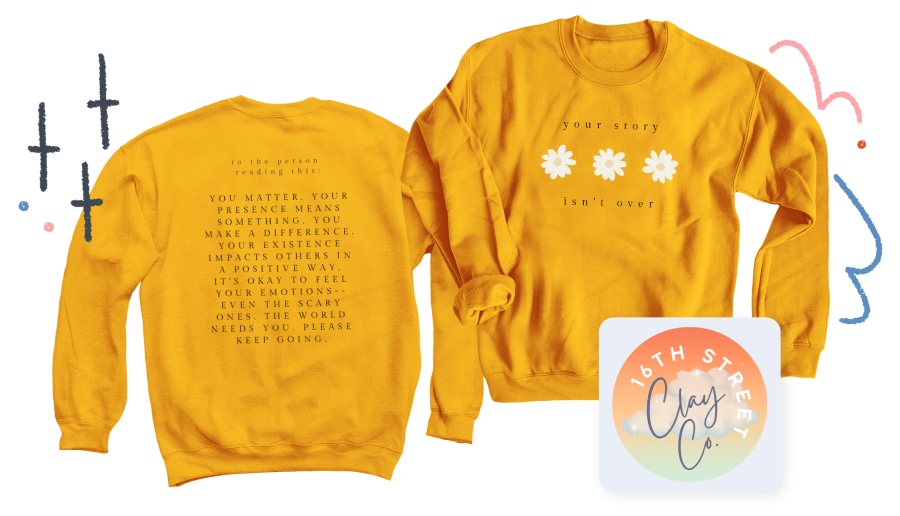 The Your Story Isn’t Over campaign by 16th Street Clay Co. was created to spread lifesaving messages of hope and raise awareness about suicide prevention. “Wearing this shirt will make a difference. You never know who’s behind you, and that’s why wearing this shirt could save a life.”