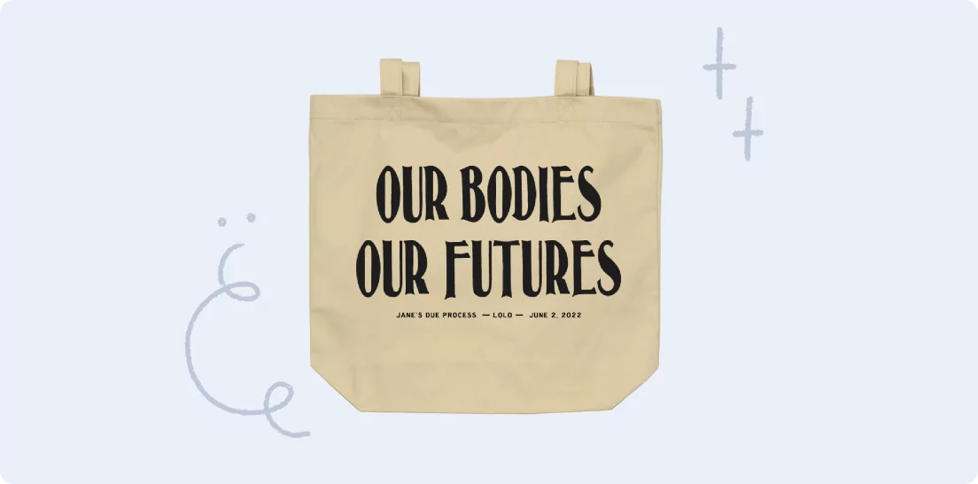 The Our Bodies Our Futures campaign was created by Jane’s Due Process, an organization that helps young people in Texas navigate parental consent laws and confidentially access abortion and birth control. Buying this tote helps work towards a future where young people in Texas have full reproductive freedom and autonomy over their healthcare decisions!