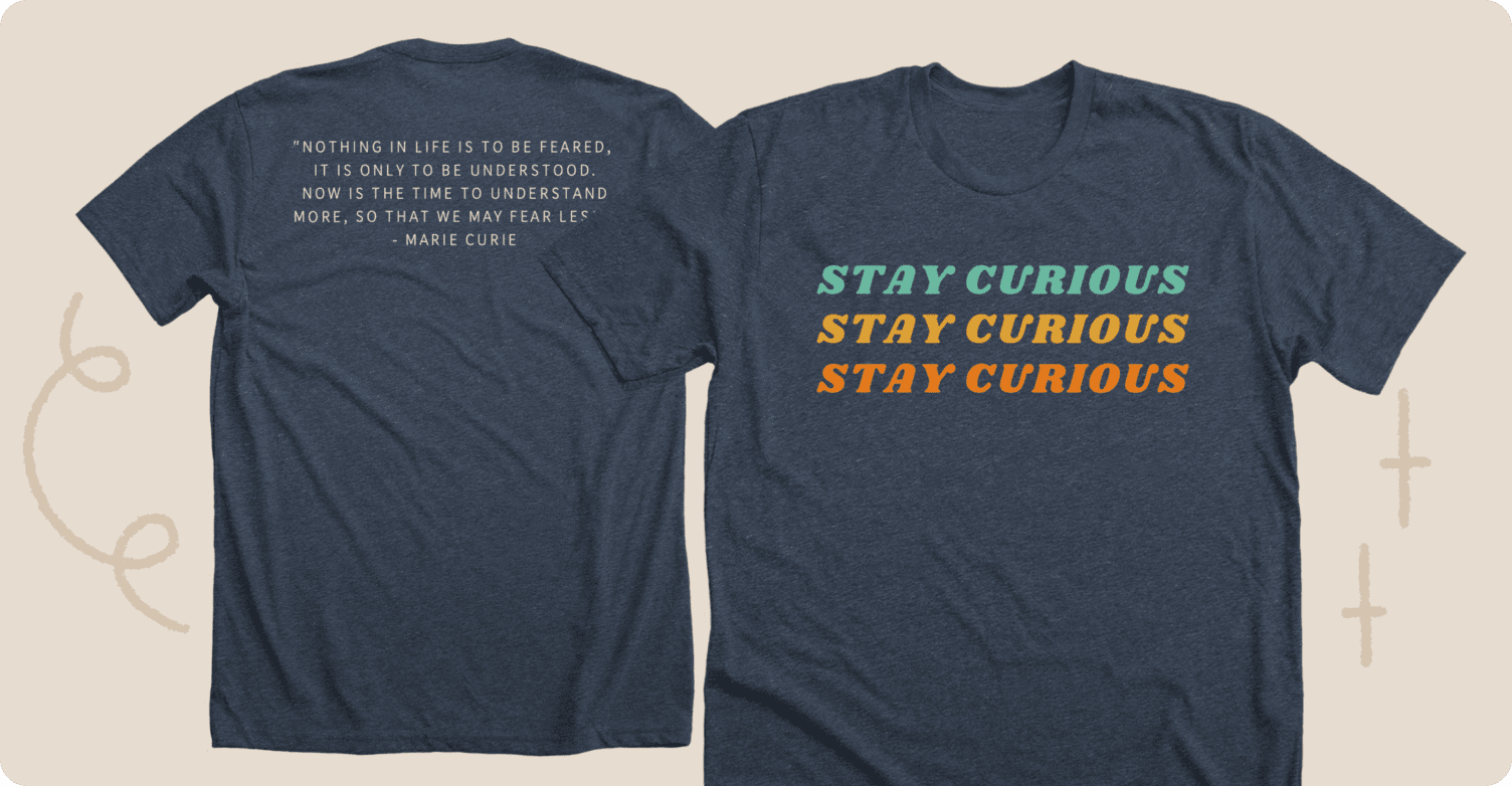 The Stay Curious campaign directly benefits Reinvented Inc, whose purpose and mission is to reinvent the general perception of women in STEM fields while inspiring interest in STEM for young women worldwide. Buying this tee helps celebrate women everywhere who are working in STEM!