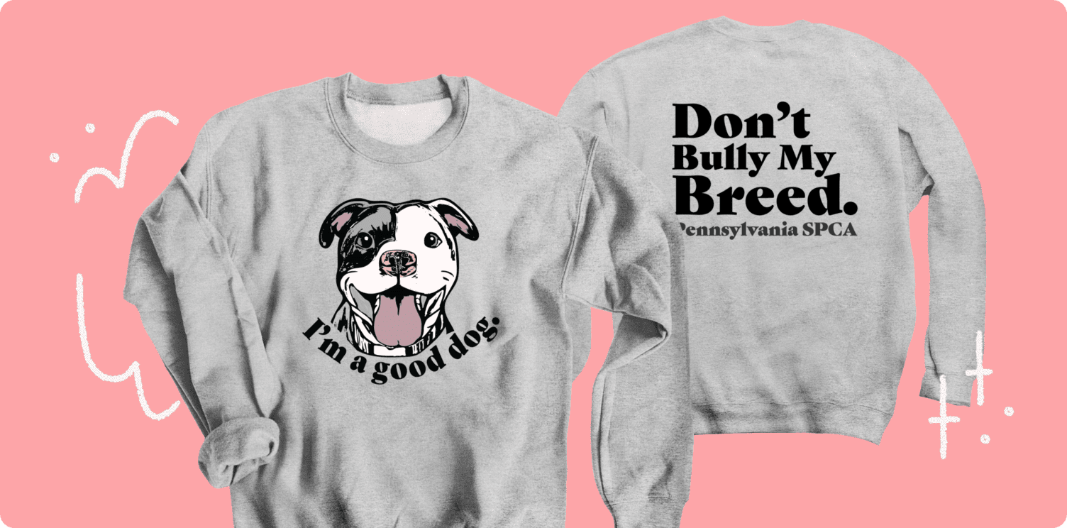 The I’m a Good Dog campaign by Pennsylvania SPCA is helping raise money for their shelter while also helping raise awareness about untrue assumptions about pitbulls. Buying this crewneck sweatshirt helps show love for the Pennsylvania SPCA and show love for pitbulls (who are really buddies and not bullies)!