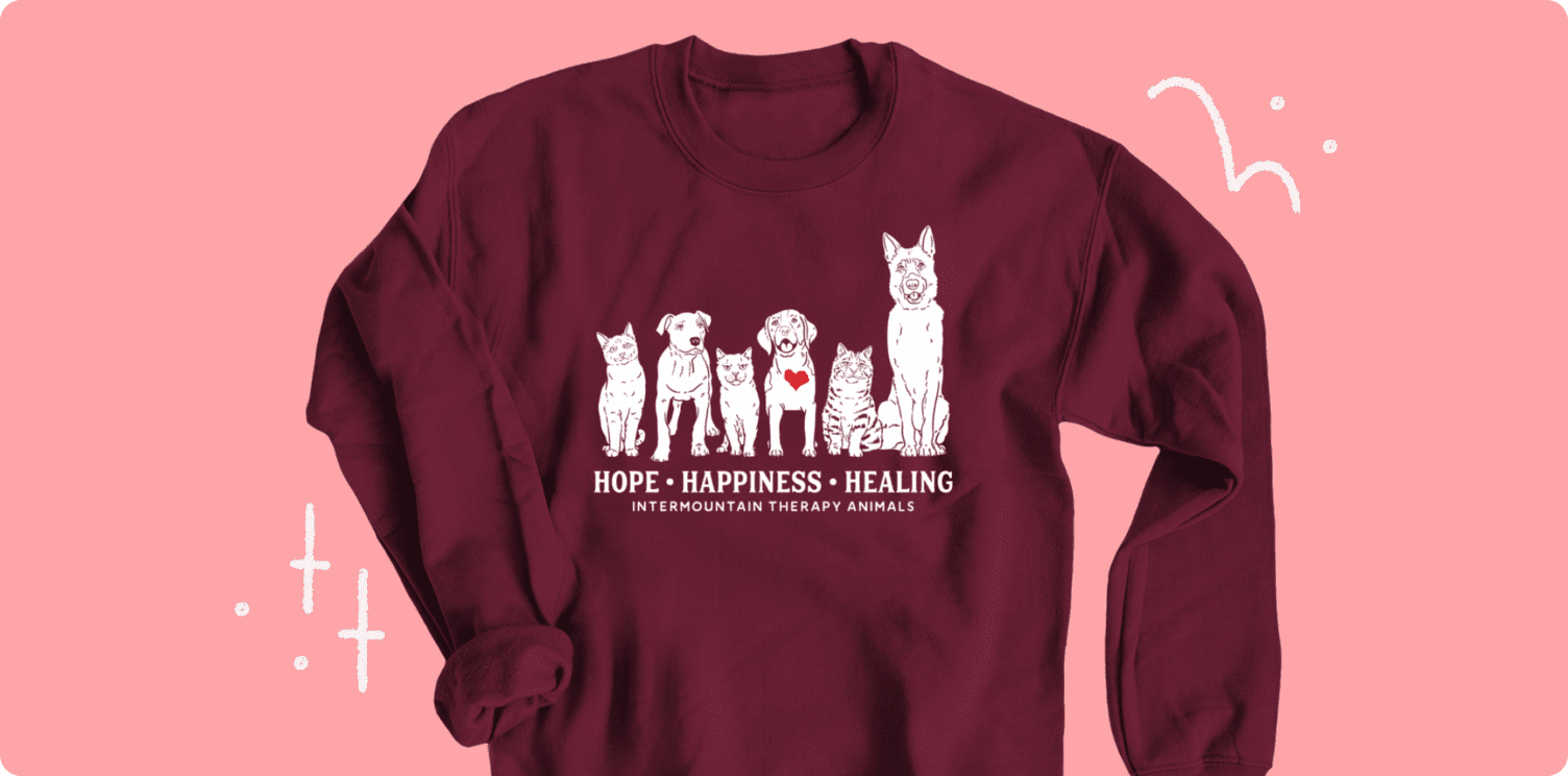The Hope, Happiness, and Healing campaign directly benefits Intermountain Therapy Animals, a non-profit organization bringing animal resources to human needs. Buying this crewneck helps support Intermountain Therapy Animals therapy teams who enhance the quality of life through the human-animal bond!