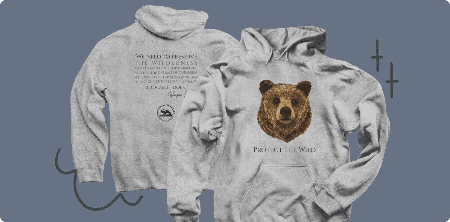 The Protect the Wild campaign by Wyoming Wildlife Advocates is raising funds for their efforts to protect wildlife in the Greater Yellowstone Ecosystem. Buying this pullover hoodie helps Wyoming Wildlife Advocates continue to educate, inform, and empower people to advocate vulnerable species so they can be managed according to science and not politics or special interests!