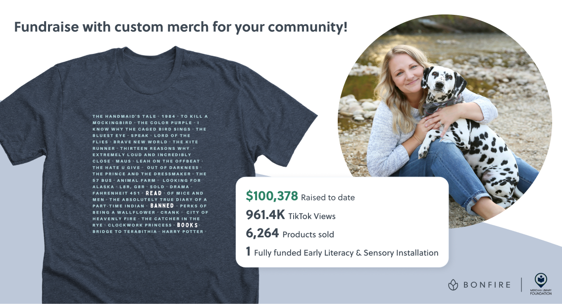 The Meridian Library Foundation caught our attention at the end of last year when sales from their Read Banned Books campaign on Bonfire suddenly skyrocketed – seemingly out of nowhere. Their campaign had gone viral, thanks to a TikTok, and was receiving an unprecedented amount of support from all over the world. Within a matter of days they had raised enough proceeds from shirt sales and donations to FULLY FUND the construction of the Early Literacy & Sensory Installations at their new library branch. Needless to say, this is a fundraising success story for the books – and it’s not even finished yet.