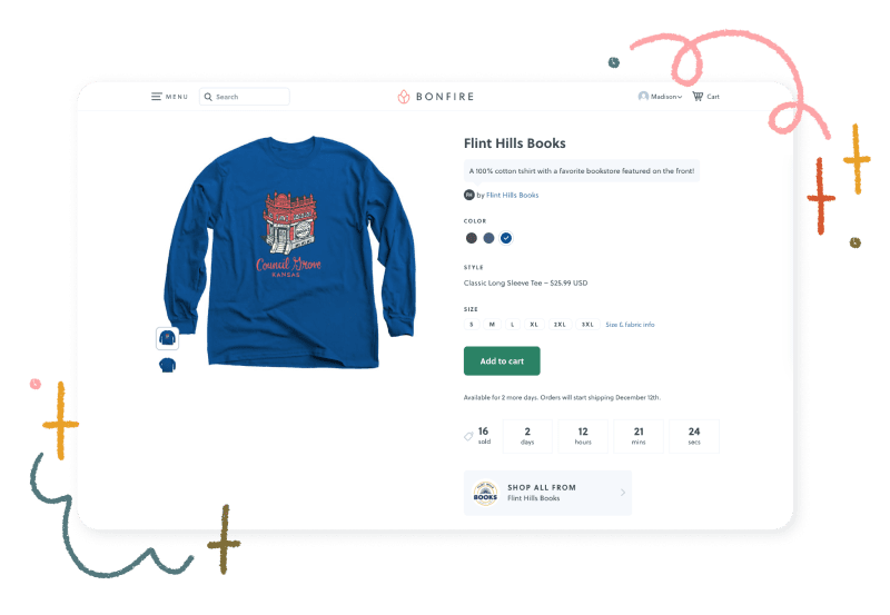 Launching a fundraising campaign on Bonfire is easy to do and costs absolutely nothing. We handle everything for you – from order processing and fulfillment to any and all customer service needs – so that you can focus your time and energy elsewhere. And when your campaign ends, we send you a payout of 100% of the profits. Easy peasy.