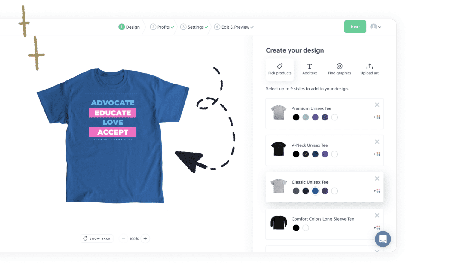 The very first step is designing your merch! It’s important to make sure your design reflects the organization you are fundraising for and/or the reasons why you are passionate about fundraising for this particular cause. Once your design is finalized, you’ll select products and color options from our product catalog. Think about your target audience when choosing what products to offer for this campaign and include a variety of options.