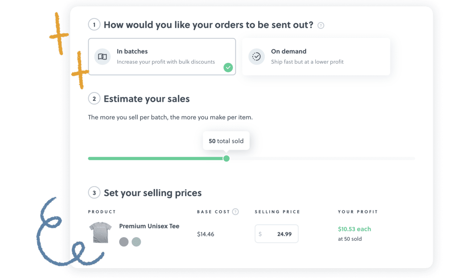 After you have solidified all aspects of your design, you’ll navigate to the second step in the setup funnel that allows you to set the prices for your items, estimate your number of sales, and decide how you would like your orders to be sent out.