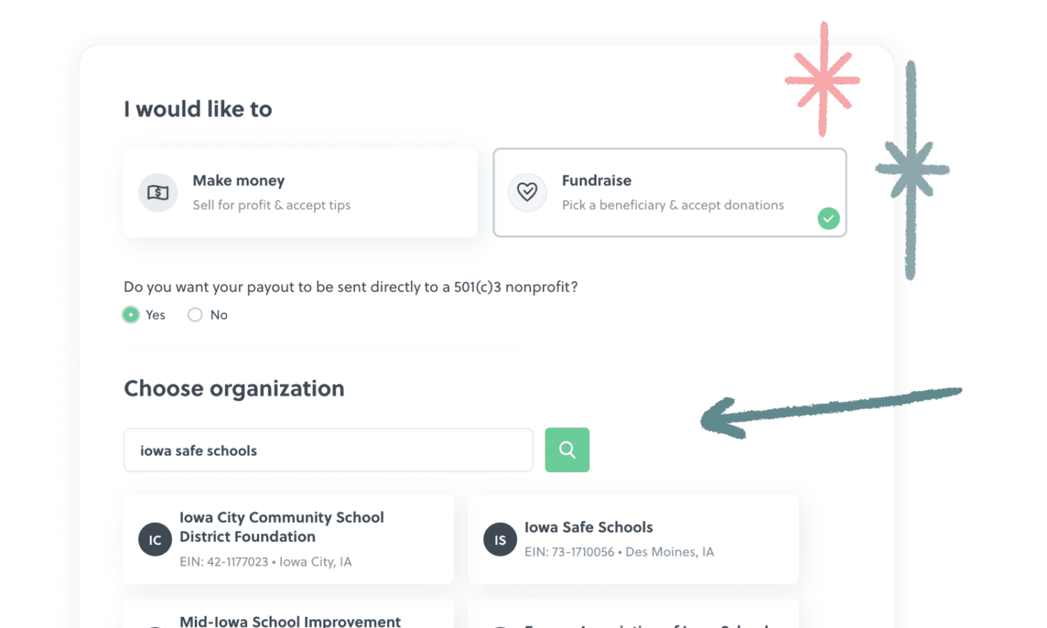 Next, you will be prompted to choose whether you would like to sell for profit or sell to fundraise. In this case, you will select ‘Fundraise’ and then select that you would like to send your payout directly to a 501(c)3 of your choice.