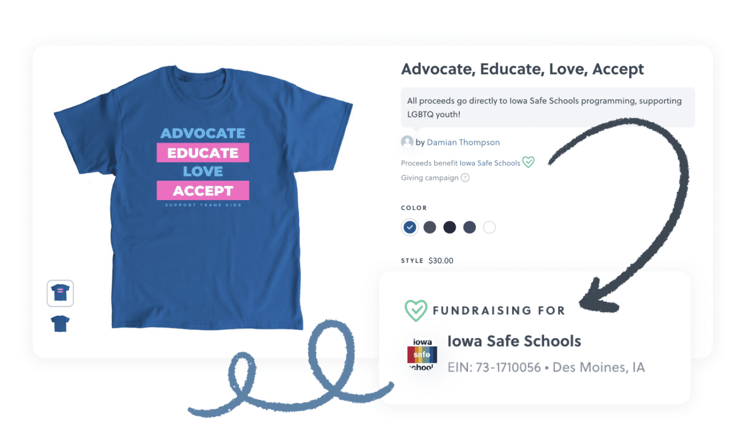 Giving Campaigns are apparel-based fundraisers that are directly connected to a 501(c)3 organization that you select. These campaigns display an official badge that lets your buyers know that all proceeds raised from your sales will be sent to that nonprofit. Setting your campaign as a Giving Campaign builds trust with your buyers and also takes the responsibility off of you to handle funds. Bonfire takes care of all the work for you and ensures the money you raise gets exactly where it needs to go.