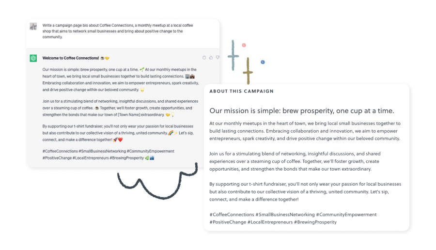 There’s one specific AI tool that you should add to your fundraising toolkit immediately, and that’s ChatGPT. Trust us when we say that ChatGPT is the secret weapon you didn’t know you needed. It’s the perfect solution to help you effortlessly tackle all the written content needs for your campaign.