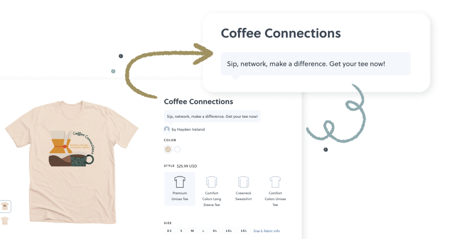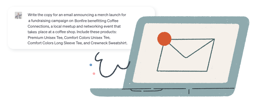 Prompt: “Write the copy for an email announcing a merch launch for a fundraising campaign on Bonfire benefitting Coffee Connections, a local meetup and networking event that takes place at a coffee shop. Include these products: Premium Unisex Tee, Comfort Colors Unisex Tee, Comfort Colors Long Sleeve Tee, and Crewneck Sweatshirt.”