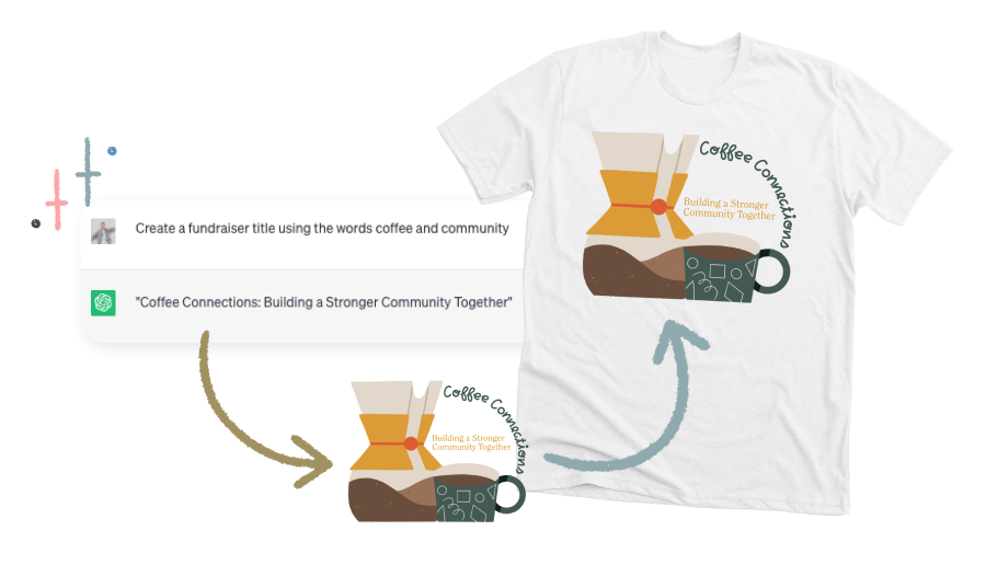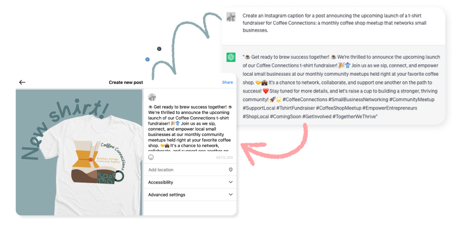 Prompt: “Create an Instagram caption for a post announcing the upcoming launch of a t-shirt fundraising campaign for Coffee Connections: a monthly coffee shop meetup that networks small businesses.”