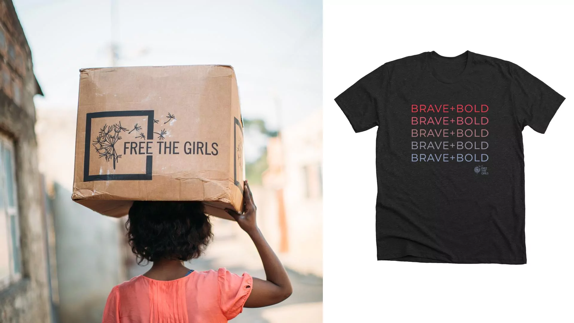 Free the Girls collects new or gently used bras and then ships them internationally to organizations in Mozambique, El Salvador, and Costa Rica that are on the ground working with formerly trafficked women. These women use this inventory of bras to sell these bras in local markets and launch their business. This unique model provides a safe and sustainable living wage while they rebuild their lives. They created their Brave + Bold tees to help raise money to purchase more inventory for these survivors of sex trafficking.
