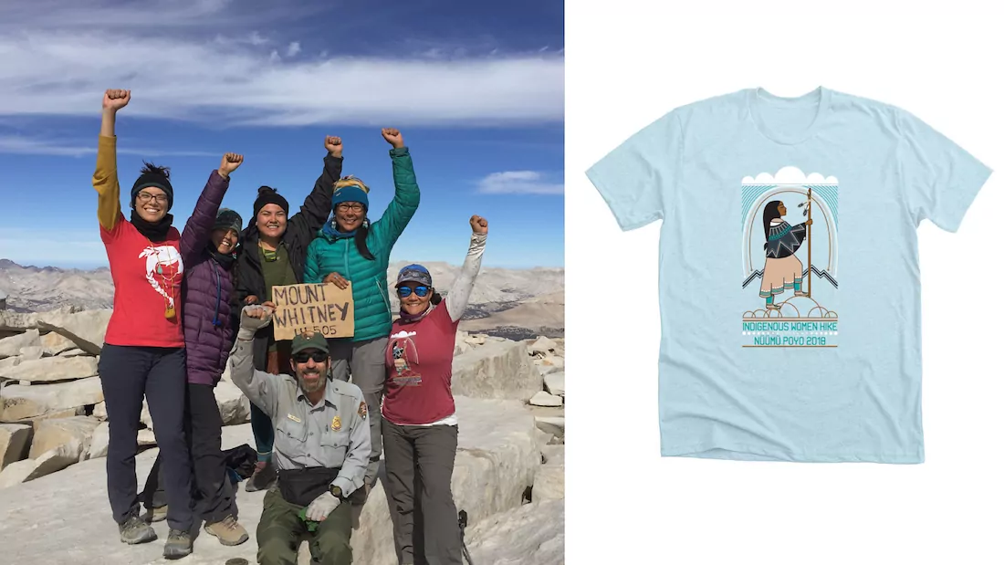 Jolie Varela is a citizen of the Nüümü and Yokut Nations. She was raised in Payahuunadü on the Bishop Indian Reservation. This area has terribly high rates of sexual abuse and suicide, and Jolie is a survivor. She started to connect to her homelands, using hiking as a channel, in her 20’s. Hiking helped to heal her from the inside out, and now she has created Indigenous Women Hike to help other women connect to the land and heal, both mentally and spiritually, just like her. The t-shirts her community creates helps them remember the journeys they take together.