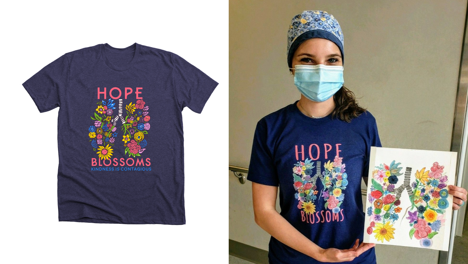 Jessica Curtisi is an ICU nurse in Columbus, Ohio who has been on the frontlines fighting COVID-19 for over a year. This pandemic has caused her to mourn more than ever before. She turned to painting as a way to cope with the intense emotions. Another nurse on her floor had the great idea of turning this into a t-shirt fundraiser to give back to the community most heavily affected by COVID-19. This t-shirt campaign, Hope Blossoms, raised over $8,000 for frontline COVID workers through United Way COVID-19 Community Response Fund.