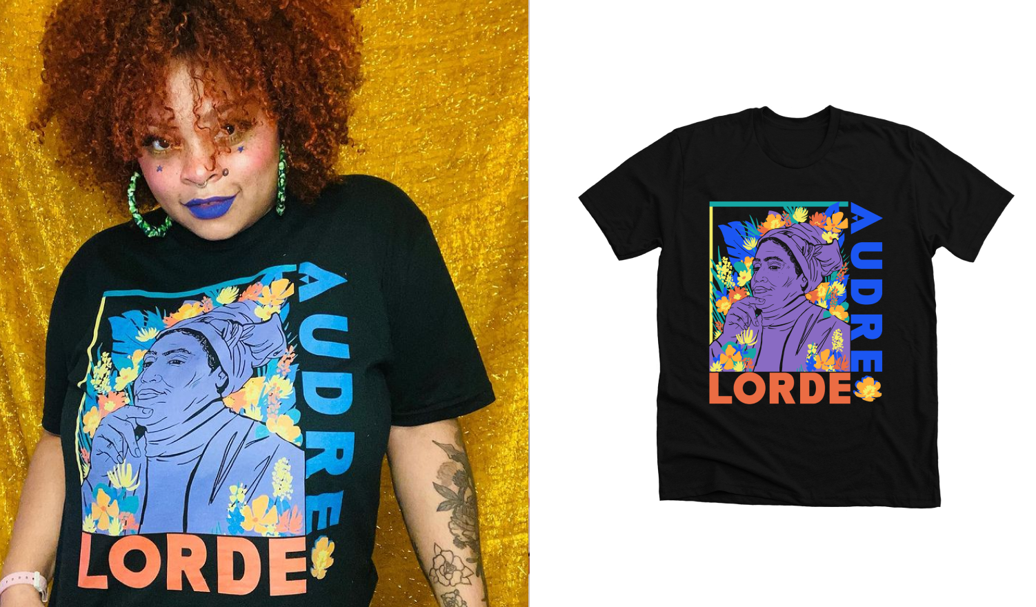 Acacia Rodriguez is a Queer Nonbinary Femme Dudebro artist working to create in radically inclusive ways. Acacia designed this shirt in honor of Audre Lorde, a Black lesbian poet who worked against the injustices of racism, sexism, classism, homophobia, and more. Acacia has been especially inspired by Sister Outsider, one of Audre Lord’s collections of essential essays and speeches.