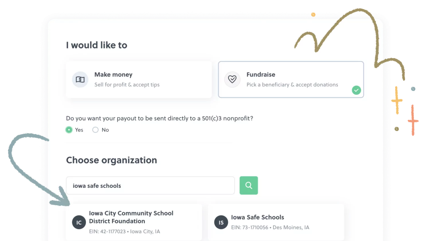 Use the search bar to find and select the nonprofit that you’re raising money for. As long as the nonprofit can be found on Candid, you can find it in our search tool. You can search using the Nonprofit’s name, or the EIN associated with the organization. Once you’ve connected the nonprofit of your choice, your campaign is automatically set up to send funds to them directly.