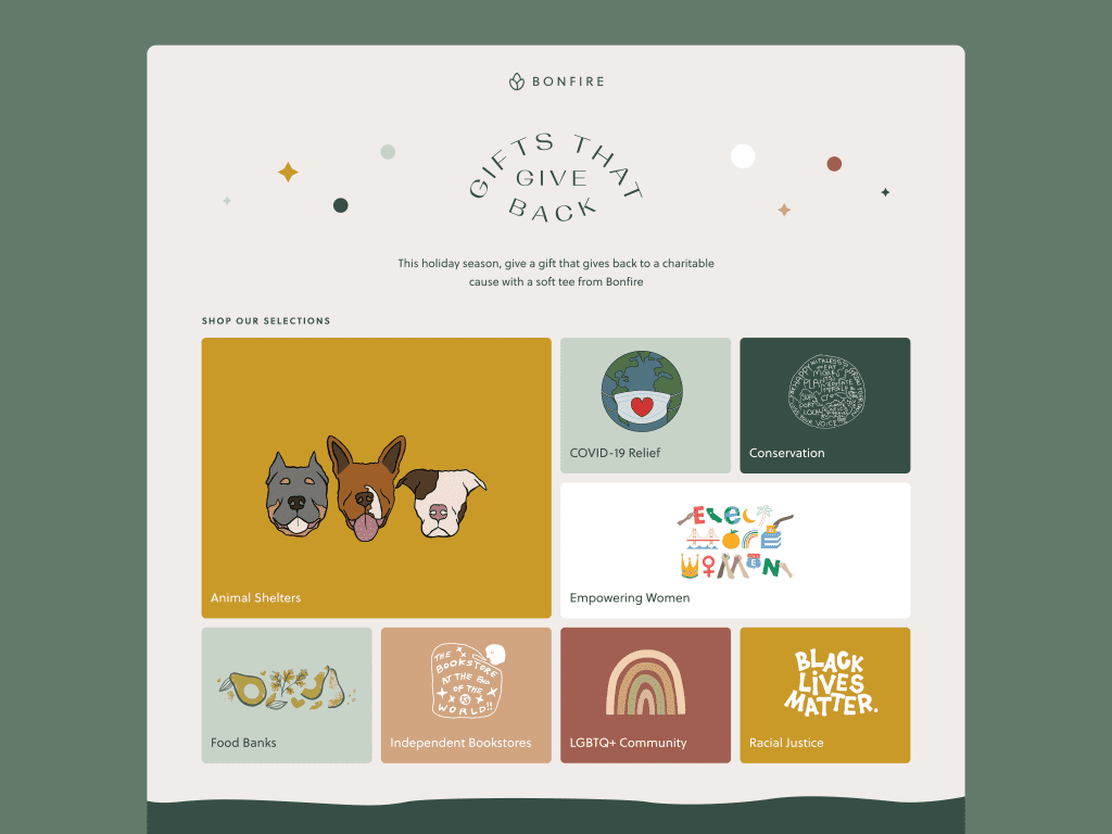As you plan your holiday season campaign, Bonfire is here to help with any questions you have about selling during these festive weeks ahead. Check out our holiday inspiration board, read about promoting your campaign, or send us a message.