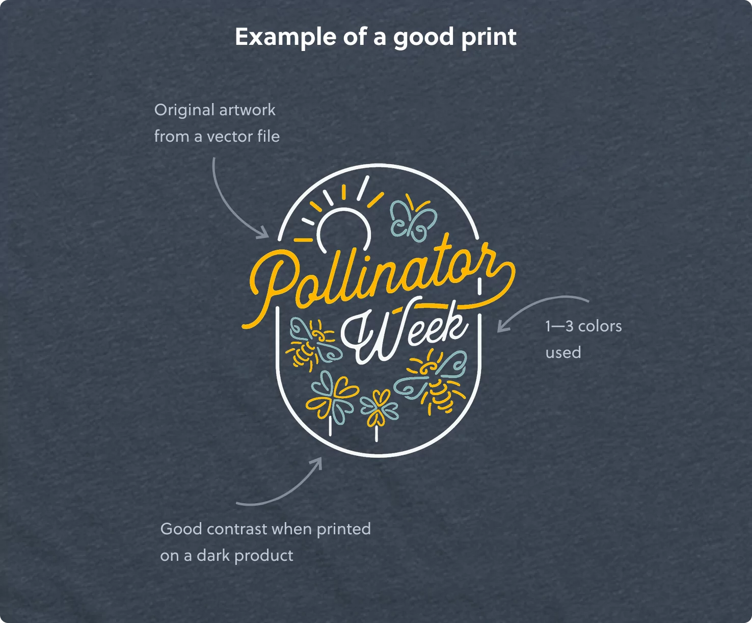It’s also possible to print your text too small, to the point that it’s only readable to someone standing right in front of the shirt. We suggest keeping your text at least a ¼ inch in height to ensure that letters print clearly. When drawing, just make sure your lines are at least 1 point size or above. And again, when printing very delicate design elements and text, choosing shirts that contrast with the ink color will also help ensure that everything is visible.