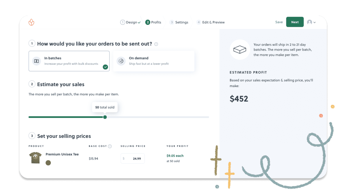 Use our t-shirt profit & cost calculator to see how much you can earn by selling on Bonfire, or to get an estimated cost of your custom t-shirt order.