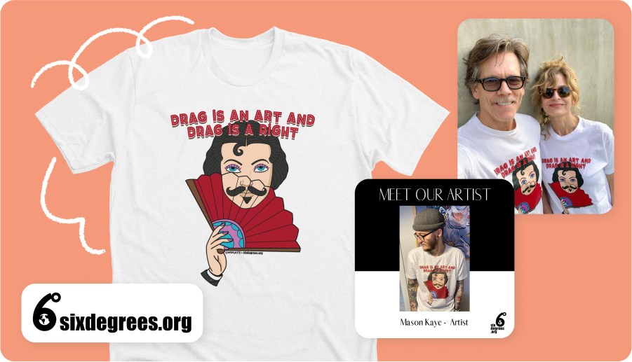This Pride Month, SixDegrees is standing up and speaking out against Drag bans and anti-LGBTQ+ policy. “Drag is a centuries old art form, and it is at the heart of the queer community because it is a celebration of their joy and their history. As of May of 2023, politicians across the country had introduced over 450 anti-LGBTQ bills overwhelmingly targeting trans youth.” The design for this campaign was created by trans artist and activist, Mason Kaye.