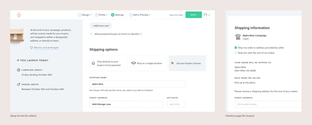 Bonfire now offers three ways to ship orders to your buyers. You can ship directly to your buyers, which is the traditional Bonfire shipping method. But you can now enable Group Shipping, which gives you complete control over order distribution by allowing you to ship all orders from your Campaign to a single location. This dramatically reduces shipping costs, which saves your community money. The third option is to allow your buyers to choose. If this selection is made, buyers will be able to choose which shipping method they prefer.