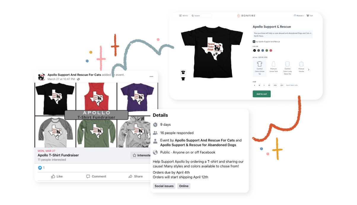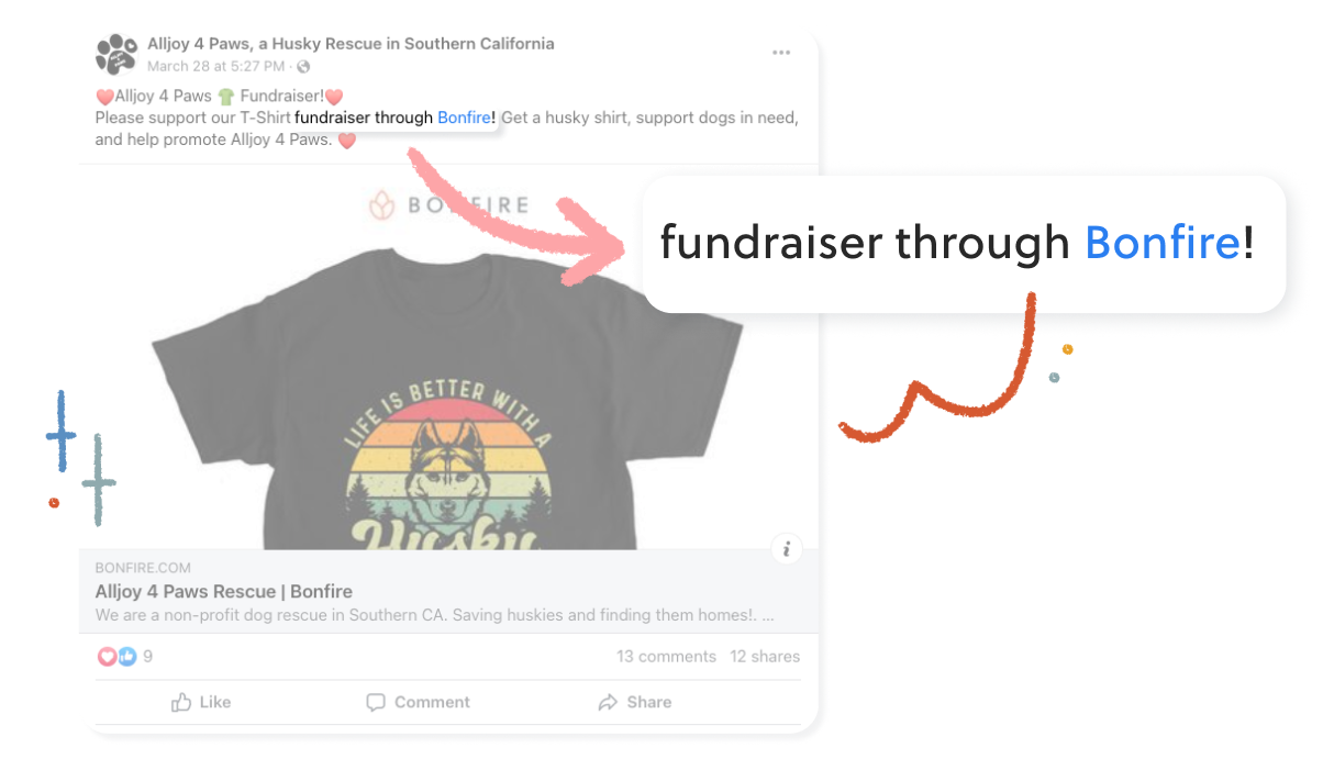 The story behind your Bonfire campaign is what will move your community to support your cause and purchase products. Use your campaign page as well as your posts on Facebook to tell your community why you created your campaign, and what their support will mean for you. Be open and honest about your fundraising goals if you have them, and specifically name what the funds will be used for.