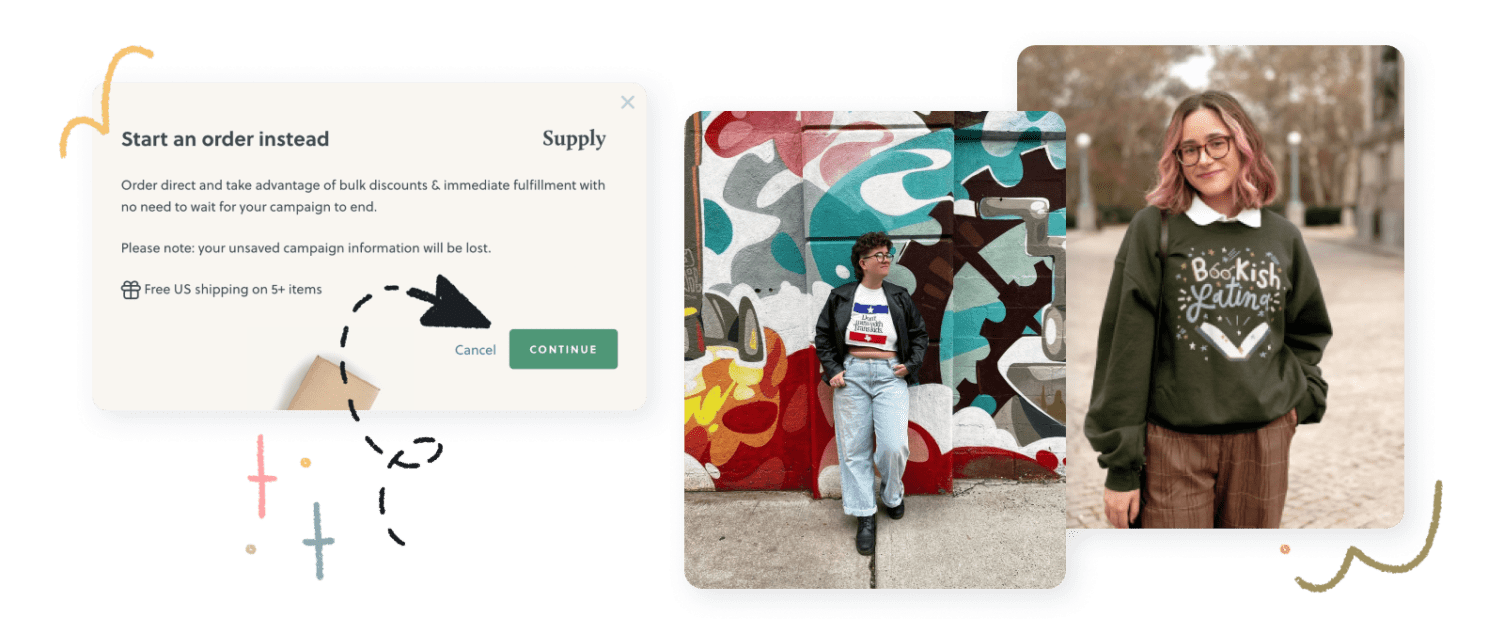 If you order some of your products ahead of your campaign, you can use them to create your promotional and marketing materials. It’s also helpful to have some physically available so that members of your community can see what the items look like in real life. You can use Bonfire Supply to order your products at-cost and have them shipped directly to you.