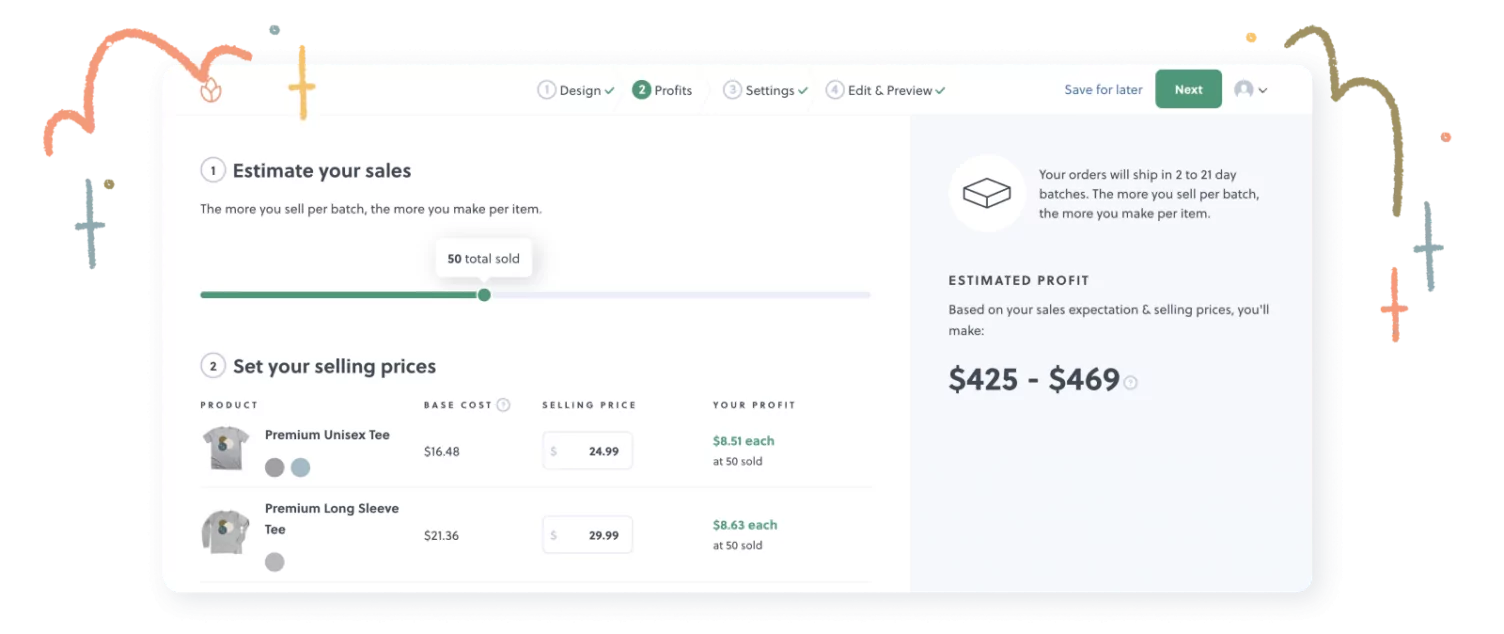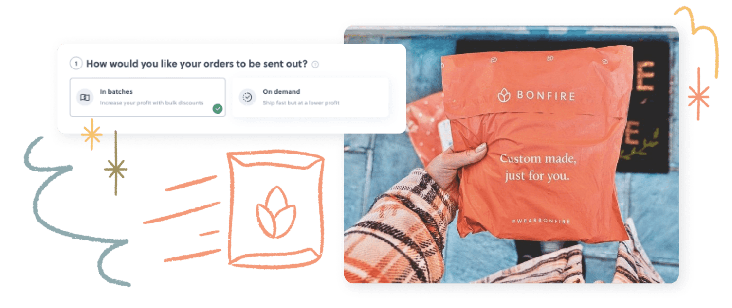 On Bonfire, there are a few different options to consider when it comes to deciding how your orders will be sent out. Choose the print option that works best for you, and don’t stress, Bonfire takes care of all payment processing, order fulfillment, and customer service for you.