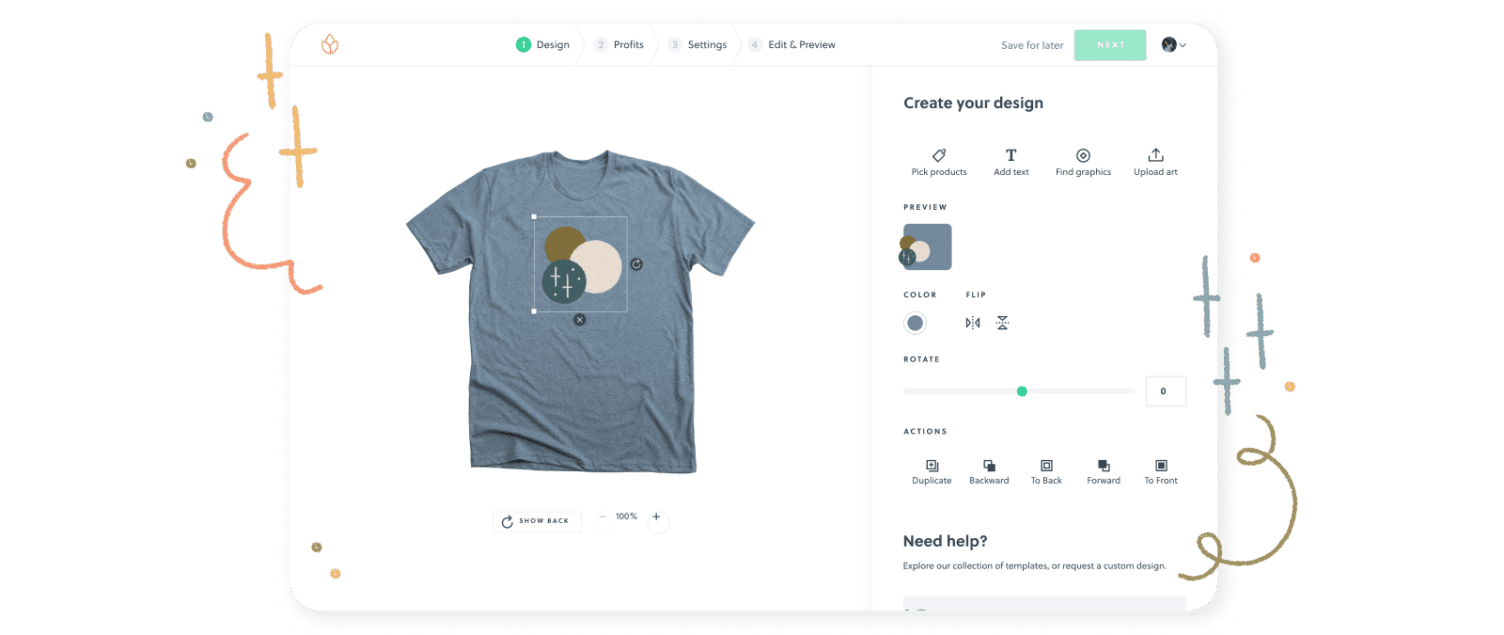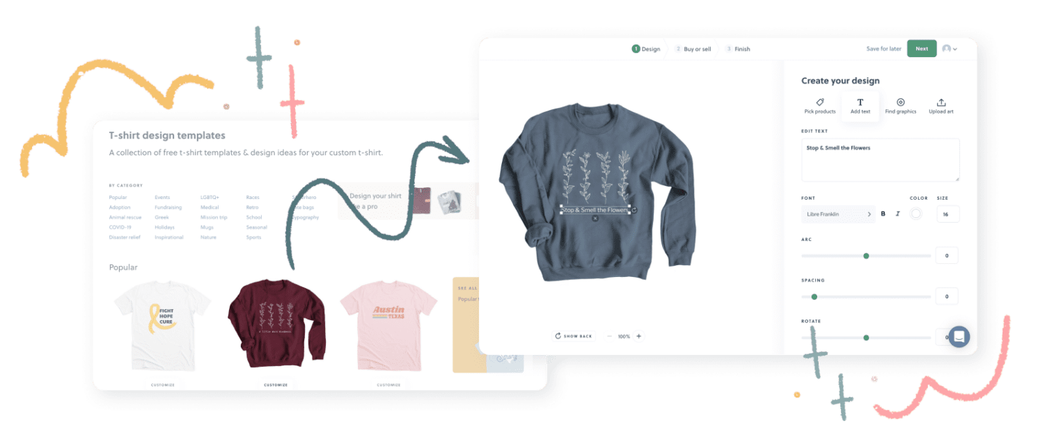 If you’re interested in getting a little design help, but still want to do the majority of the work yourself, you can use Bonfire’s design templates. We have a selection of over 1,000 free design templates you can use and customize to suit your needs. Using a template is a great way to ease into the design process while still being able to add edits to personalize your design to fit your brand or cause.
