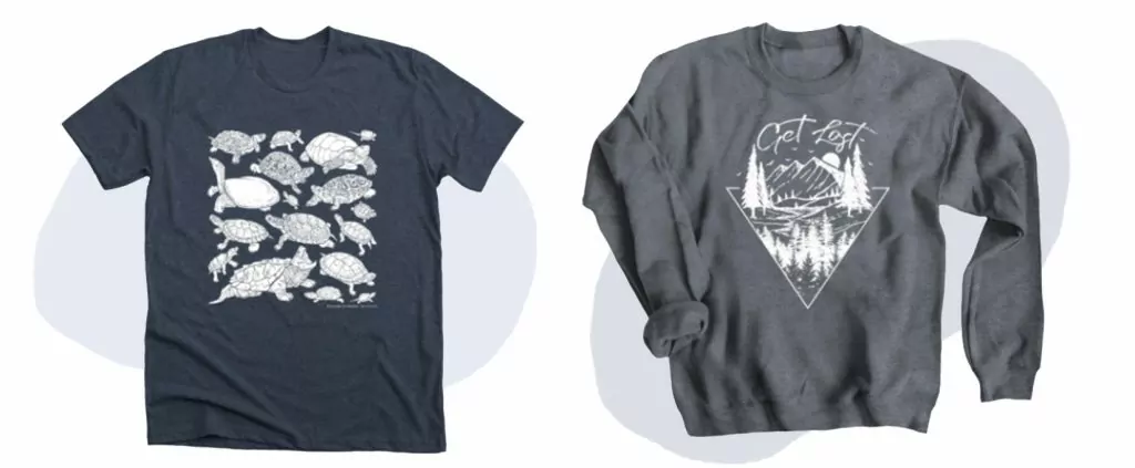 The turtle design used the t-shirt color as the linework, helping to define the shapes of the turtle shells with blank space. The “Get Lost” design leaves areas that would typically be filled with a color blank so that they can be filled in by the color of the shirt instead. This design style typically works best with high-contrast color combinations. Select a dark-colored garment if you want your lines to be a light color. Select a light-colored product if you want your linework to be dark.