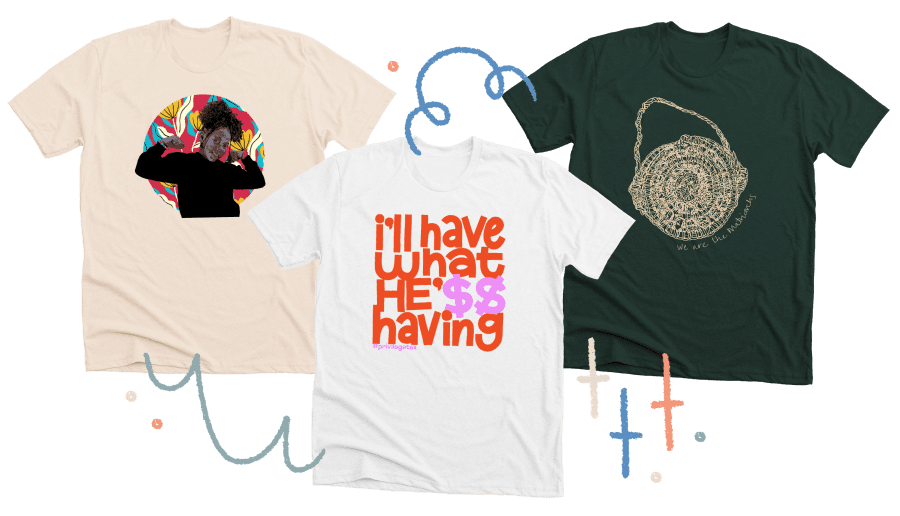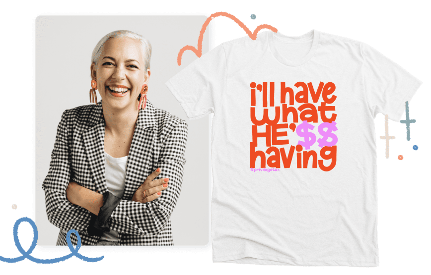 “My style is to have fun type, for this shirt I wanted a bold statement that starts the conversation around the gender pay gap, “I’ll have what he’s having” is a design I did in my early days and wanted to revisit it for the tee, it is a bit tongue in cheek, but in all seriousness, I will have what he’s having… with a side of equality.”