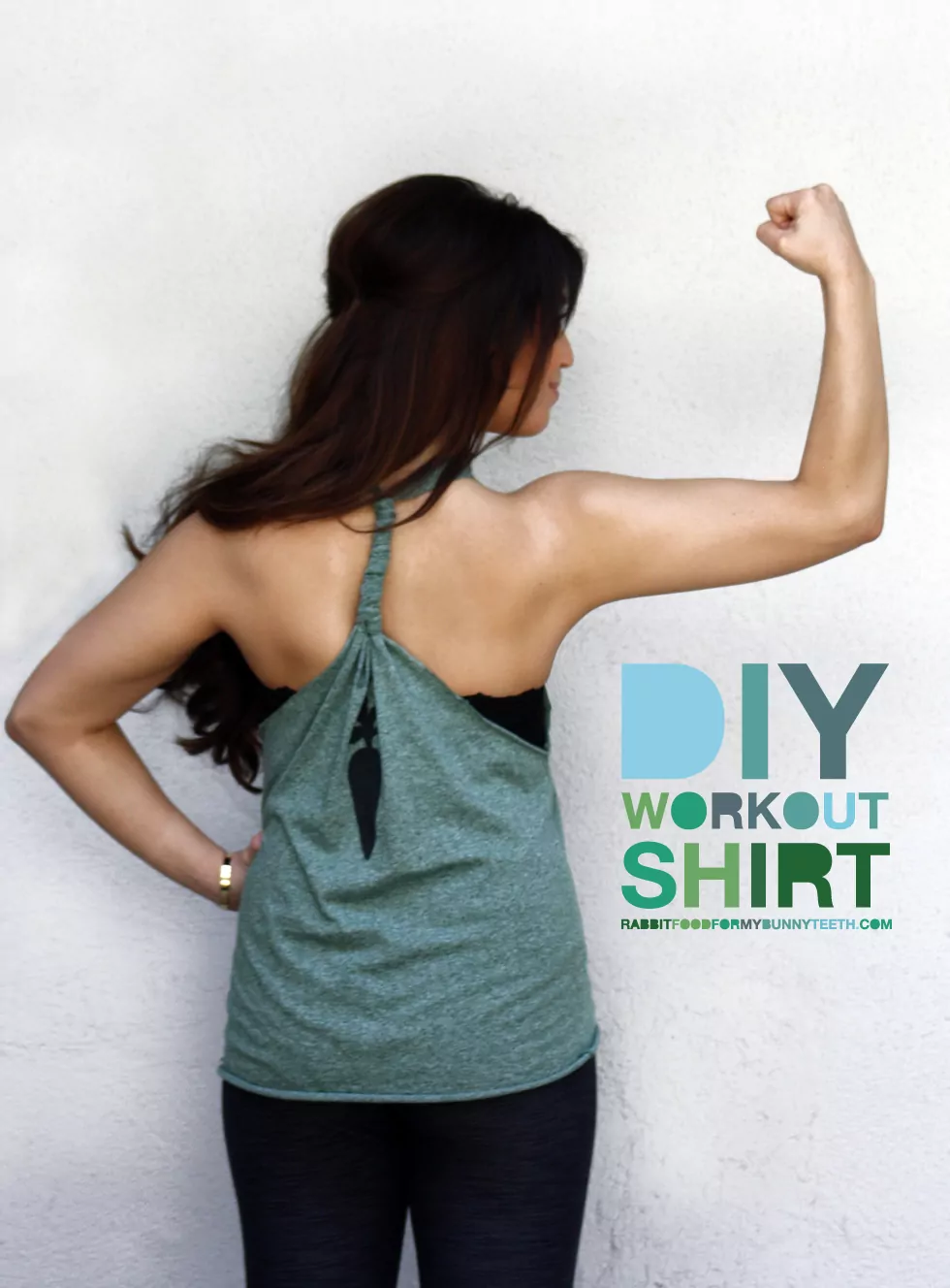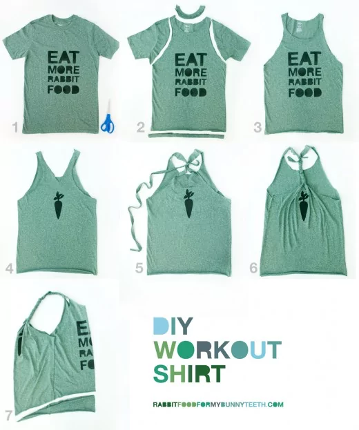 In just a few easy steps, you can turn your old tees into racerback workout tank tops! No sewing or gluing is necessary. Instead, you just need to strategically cut the collar and sleeves, then use a creative knot-tying method for the back of the shirt. You’ll be ready to exercise and ready to sweat in your “new” tank top in no time!