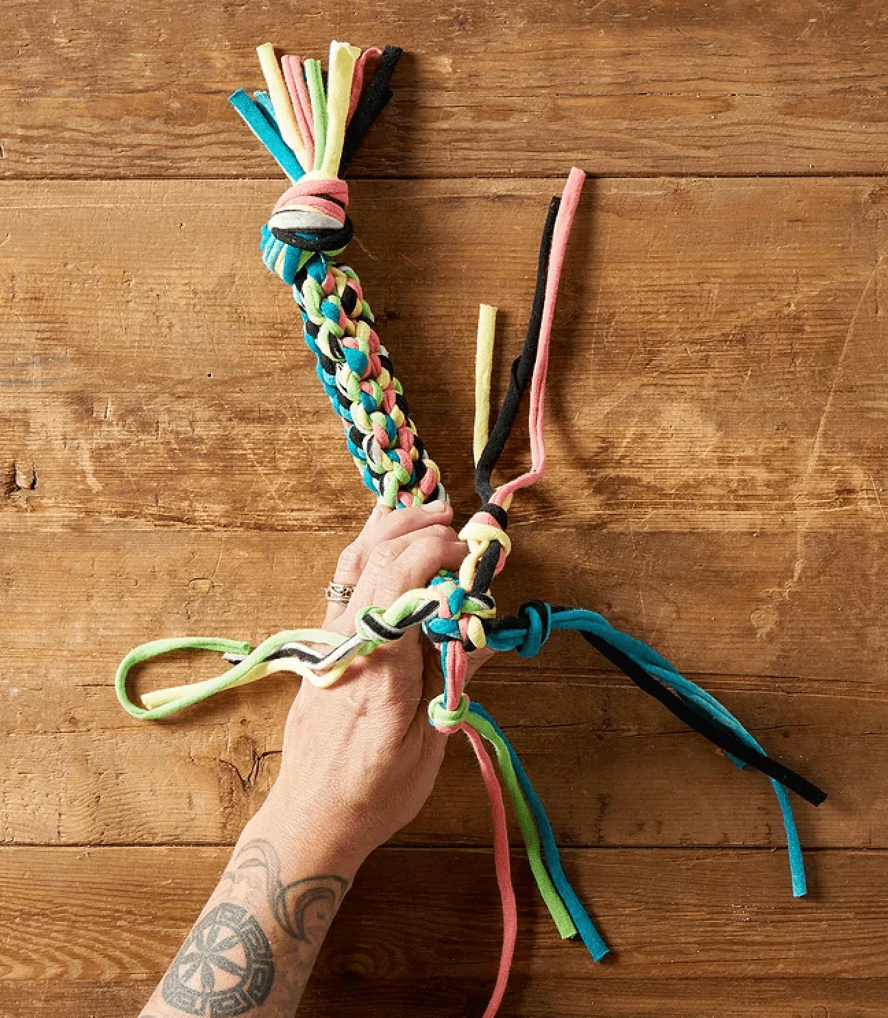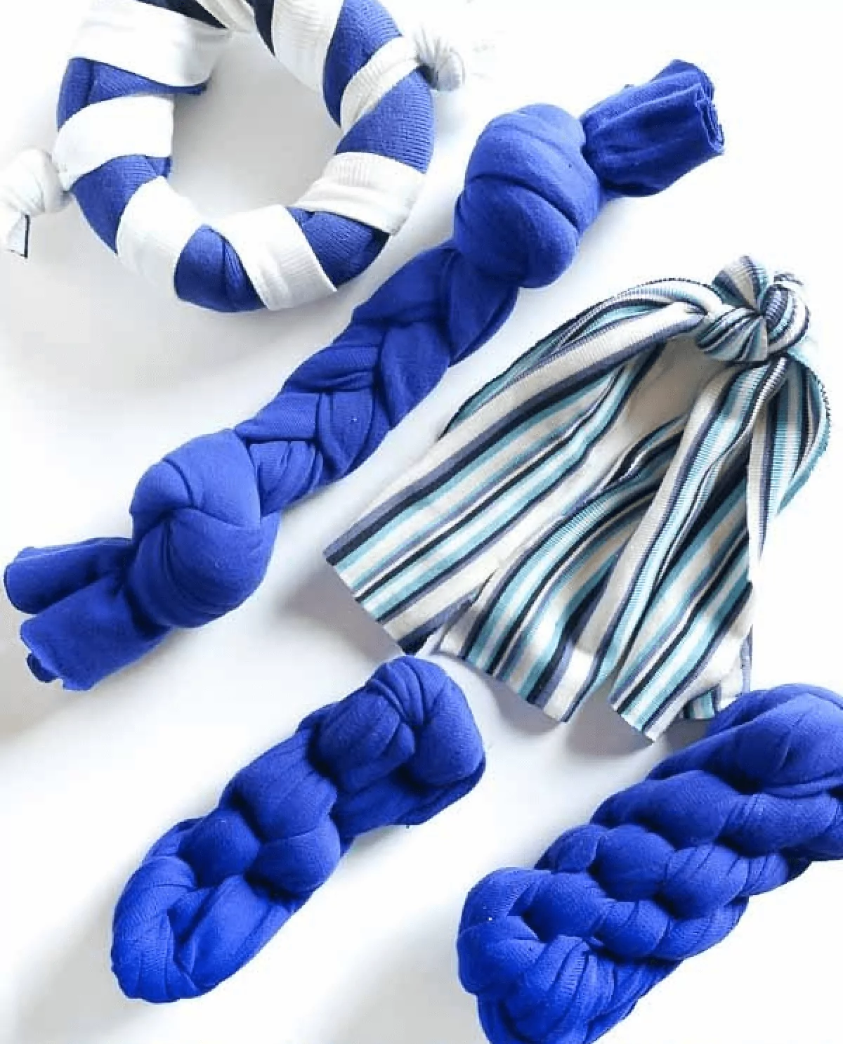 Your furry friend will definitely appreciate you turning old tees into toys for them to play with! You’ll have a brand new collection of eco-friendly dog toys without having to spend a dime. Typically, you’ll use thick strips of fabric and tie them into durable knots or braids that can withstand chewing and playtime. Try out these different t-shirt dog toy ideas and see which ones your dog likes best!